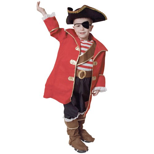 This red pirate captain Halloween costume set by Dress Up America is perfect for your little boys next treasure hunt This theatrical-quality outfit features a gold trimmed red jacket and red and white striped shirt Pants have attached boot covers and an elastic waistband for comfortable fit The Read More..
